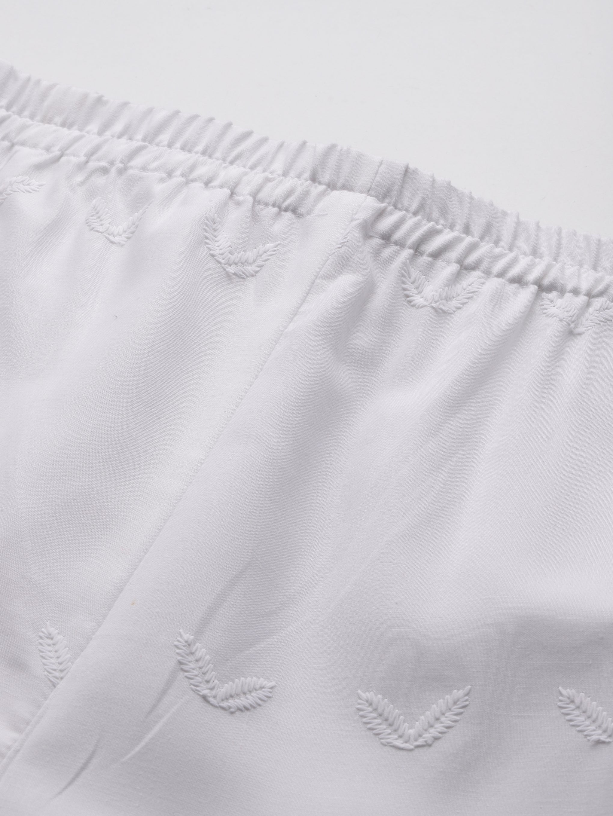 Elevate your everyday style with our White Embroidered Palazzos, designed for both elegance and comfort.Crafted from soft, breathable fabric, they feature a smooth inner lining for added ease and coverage. The fully lined fabric provides proper coverage and a smooth feel, making them comfortable for long wear. The detailed embroidery adds a subtle festive charm, perfect for casual gatherings, office wear, or small occasions.With an elastic waistband for a flexible fit and an ankle-length cut for a clean finish, these palazzos ensure both style and ease. The side pocket adds practical convenience, making them a versatile addition to your wardrobe.